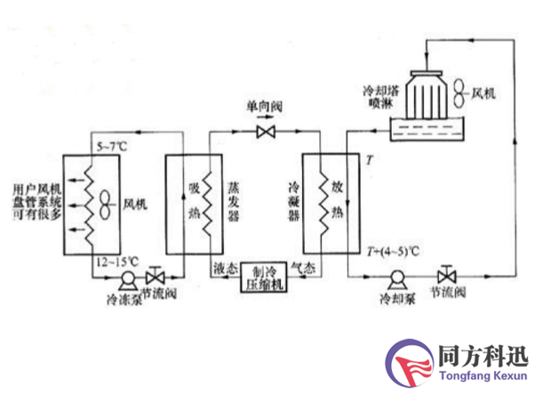 制冷機通過壓縮機將制冷劑壓縮成液態后送蒸發器中與冷凍水進行熱交換,將冷凍水制冷,冷凍泵將冷凍水送到各風機風口的冷卻盤管中,由風機吹送達到降溫的目的。經蒸發后的制冷劑在冷凝器中釋放出熱量成氣態,冷卻泵將冷卻水送到冷卻塔上由水塔風機對其進行噴淋冷卻,與大氣之間進行熱交換,將熱量散發到大氣中去。